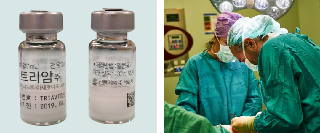 표피낭종의 크기가 작은 상태라면 여드름 등에도 사용되는 트리암시놀론주사를 시도해 볼 수 있습니다. 트리암시놀론은 스테로이드 주사제로 빠르게 염증을 가라앉히는 효과를 가지고 있으나, 항생제와 마찬가지로 표피낭종의 근원인 주머니 자체를 제거하지 못하므로 재발될 수 있다는 점을 염두에 두셔야 합니다.