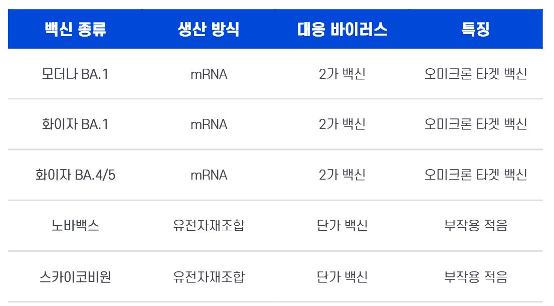 기존에는 접종 병원과 일정에 따라 백신이 결정되는 방식이었으나, 백신의 유형이 다양해지면서 개인의 건강상태나, 선호도에 따라 선택할 수 있게 되었습니다. 오미크론 변이에 대항 효과가 높은 mRNA 2가 백신을 접종하는 것이 우선되지만, mRNA 백신의 부작용 등으로  접종이 어렵거나 mRNA 접종을 원하지 않을 때는 접종 후 부작용이 적은 유전자재조합 백신을 선택할 수 있습니다.